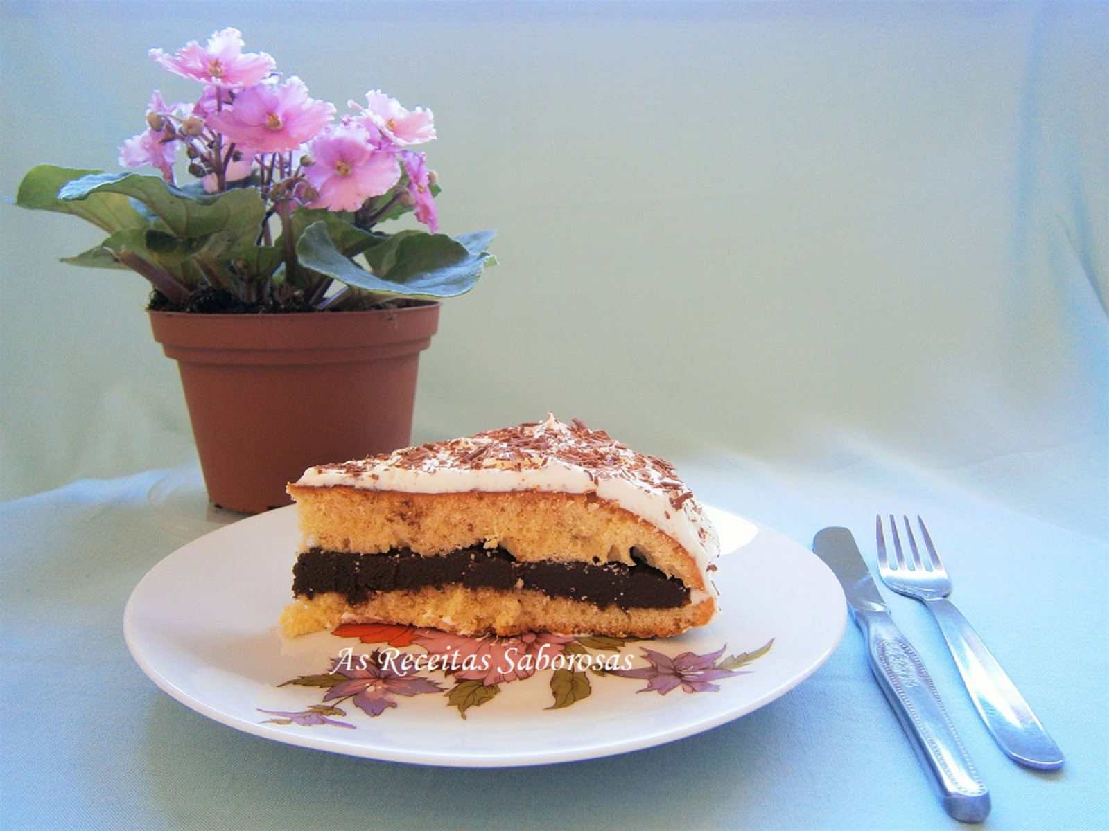 Corte o bolo em duas partes, numa das partes verta o creme de chocolate, e coloque por cima a outra parte do bolo.